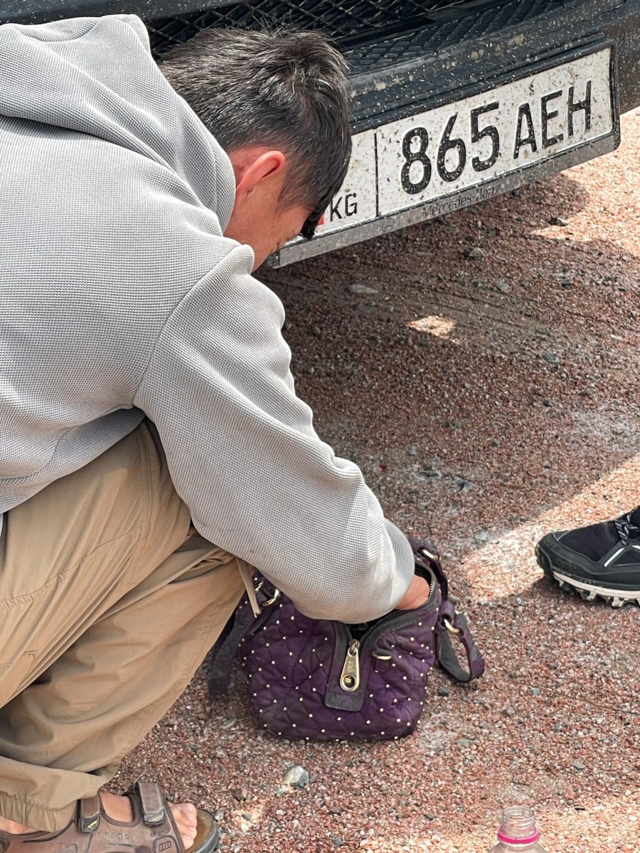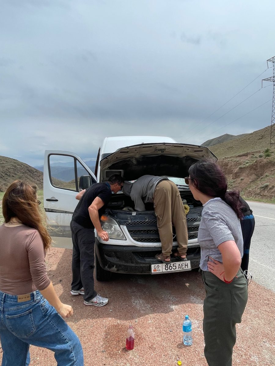 La nuit fût paisible et réparatrice pour les malades. C’est le coeur lourd d’une fin de voyage que nous reprenons la route. Ce matin, nous descendrons à Kolchkor pour faire une halte restauration au même guesthouse où nous avions séjourné. Les kilomètres de piste s’enchaînent, notre véhicule secoue ses occupants mais laisse notre chauffeur misterT placide, rien ne le perturbe …. enfin jusqu’à un bruit suspect…les secousses ont eu raison du tuyau d’alimentation du turbo, il a perdu deux vis et ne tient plus. On enlève deux vis du capot que l’on met sur le tuyau avec des outils sortis d’une jolie trousse… et nous repartons rapidement.