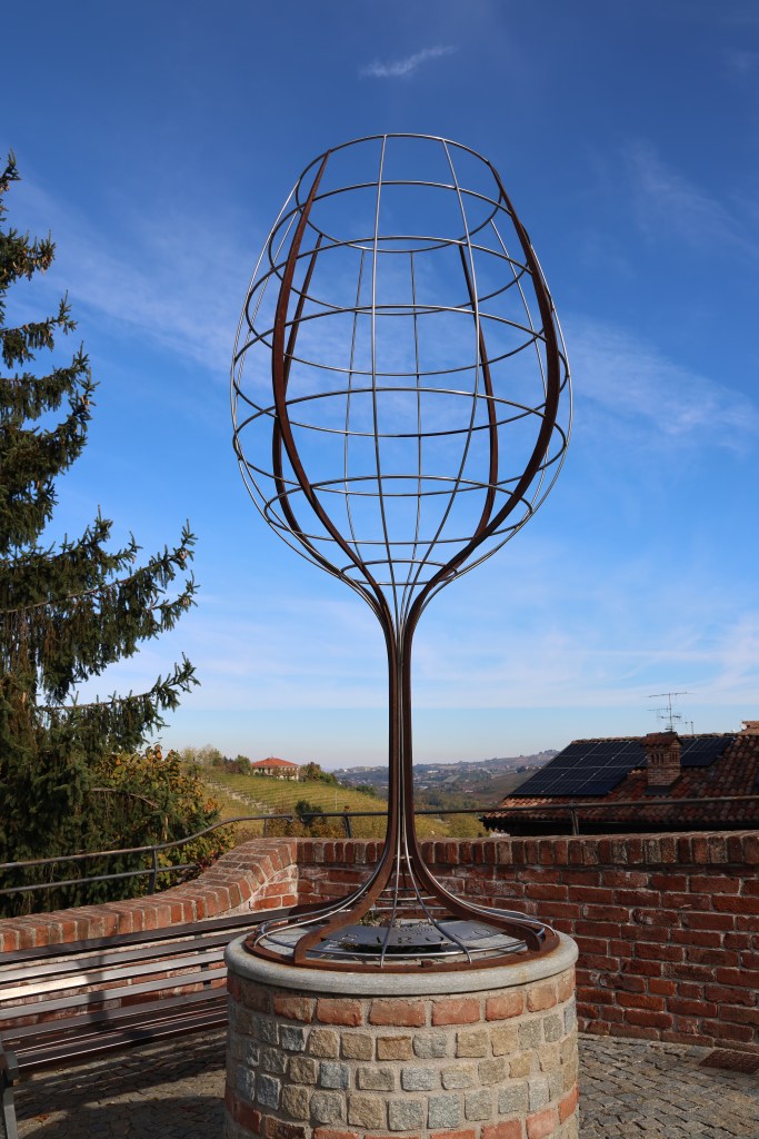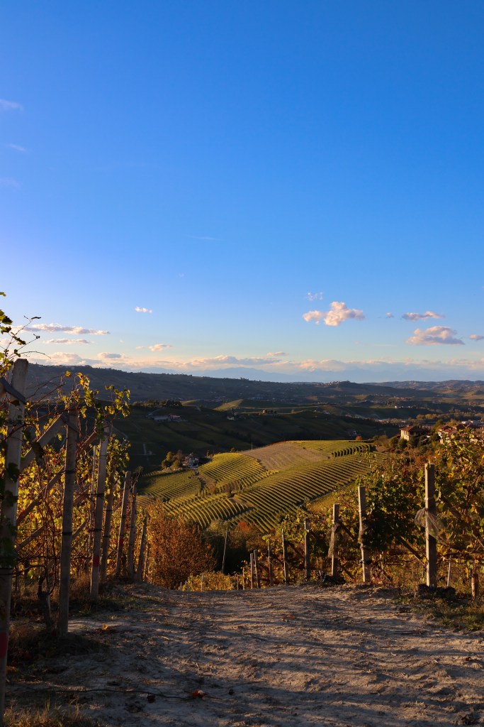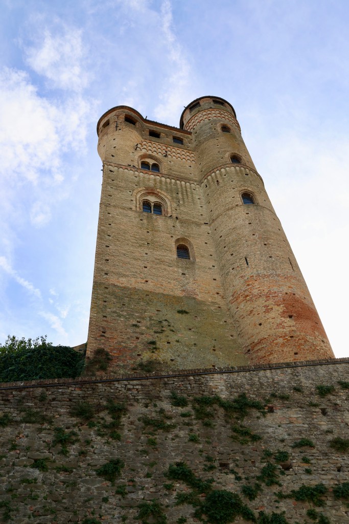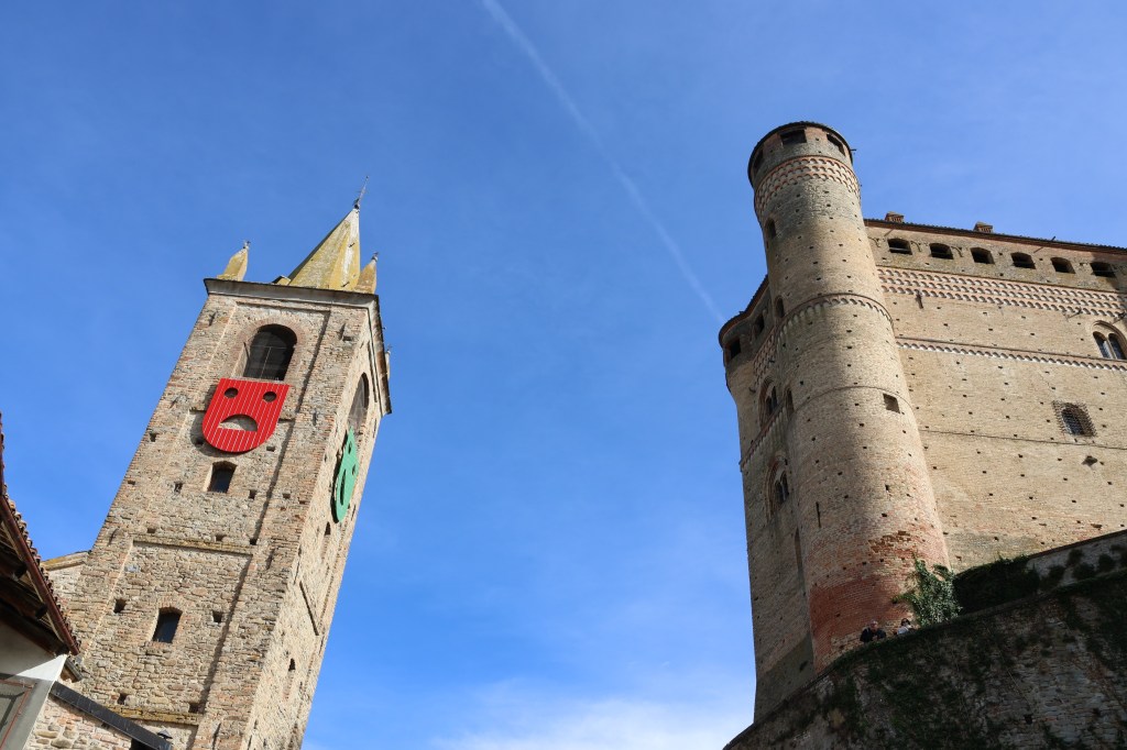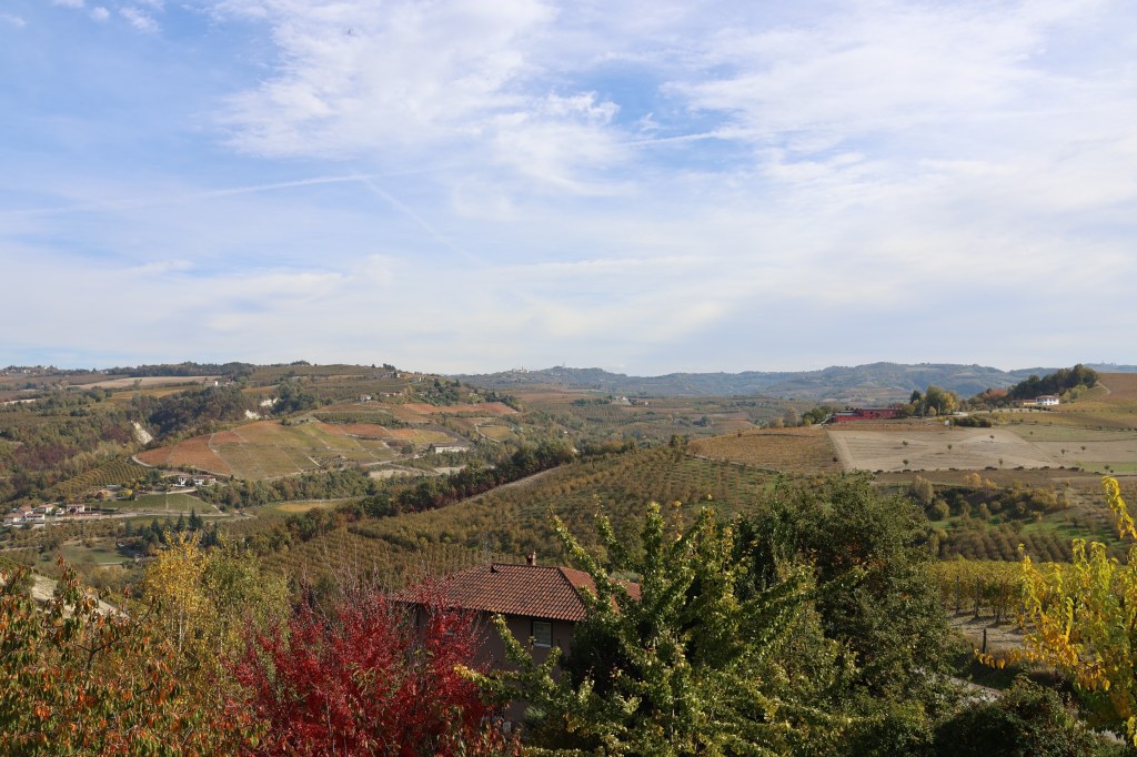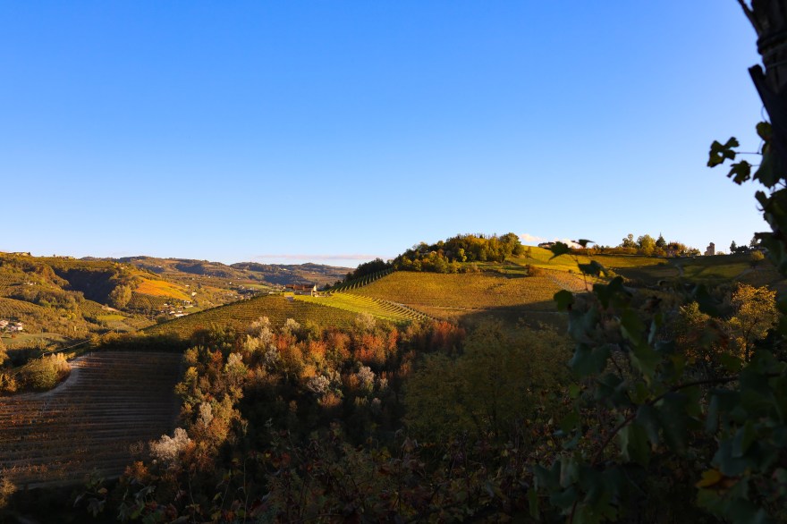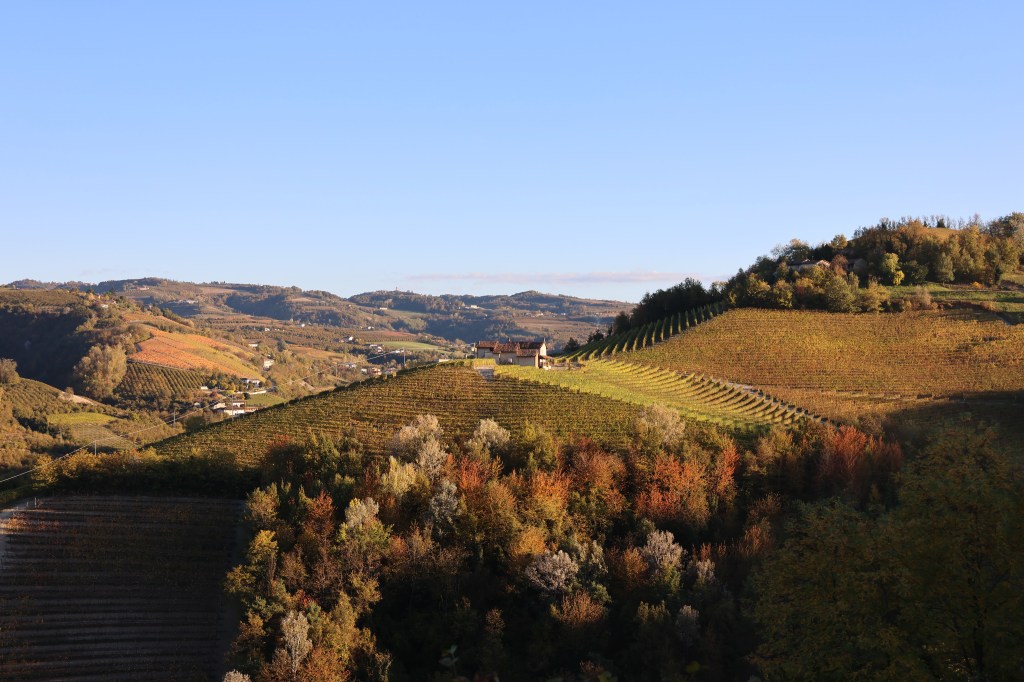 Nous reprenons notre route au milieu des vignes et des noisetiers, les couleurs d’automne nous donnent envie de nous arrêter à chaque contour , sur chaque crête, au fonde de chaque vallée. Nous montons jusqu’à Serralunga d’Alba , joli petit village perché sur une colline avec une vue incroyable.