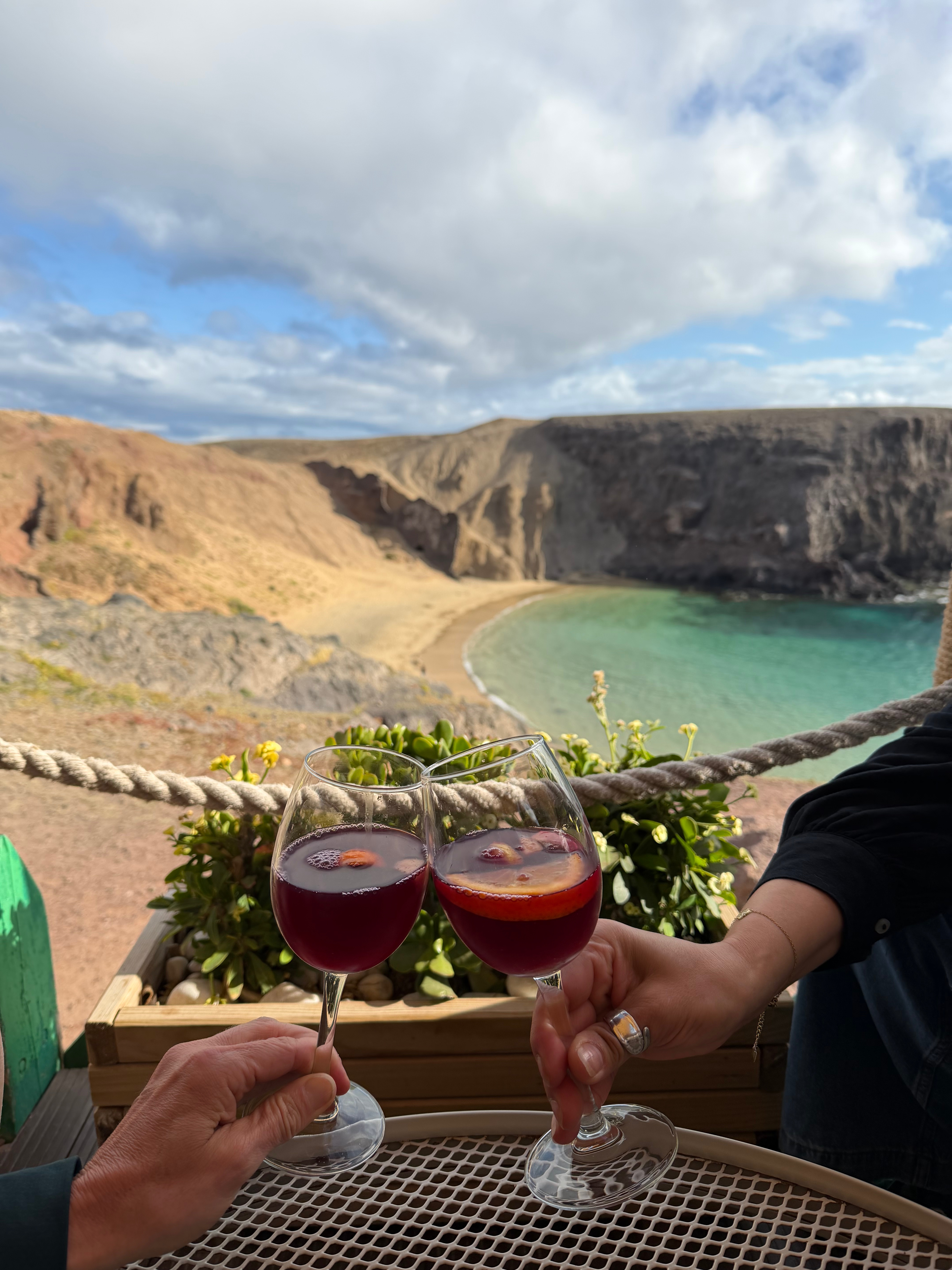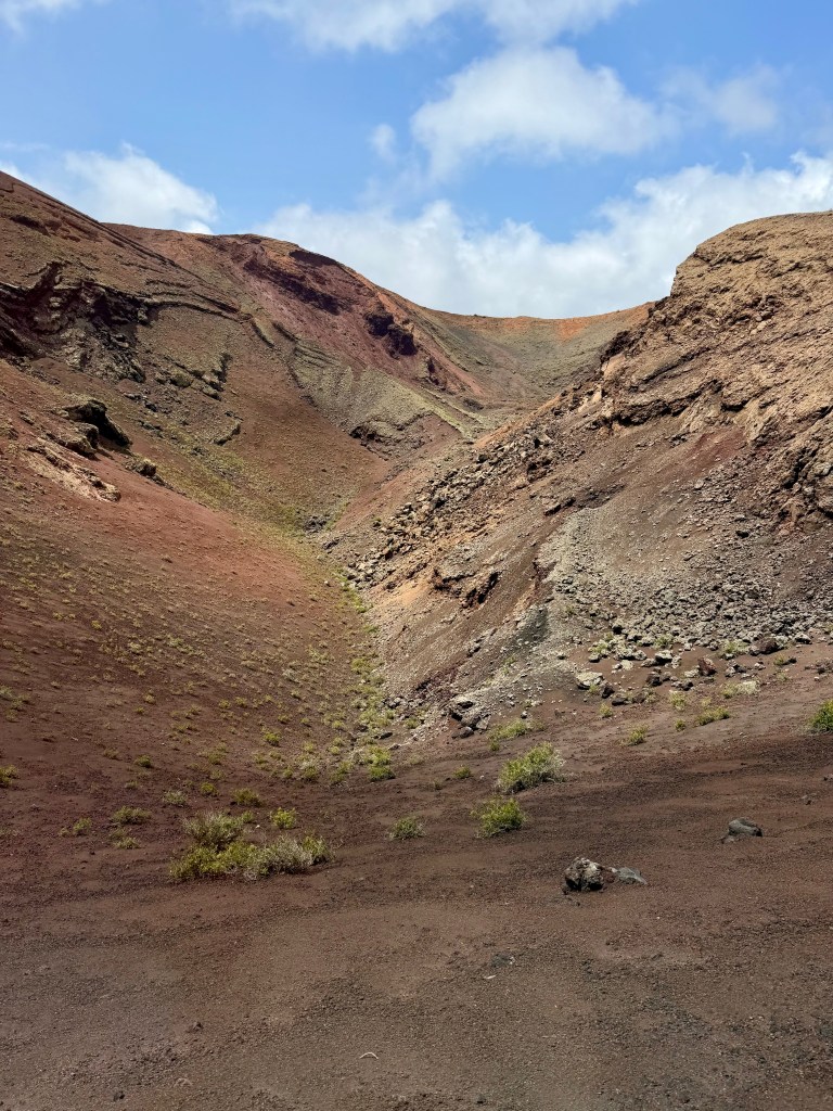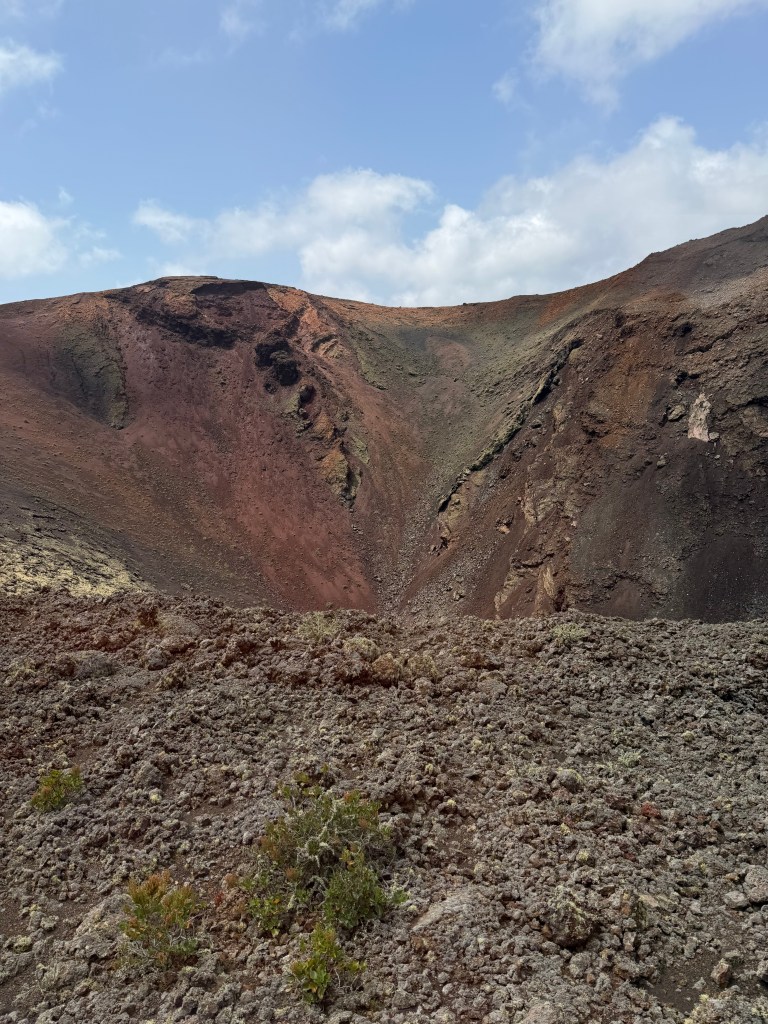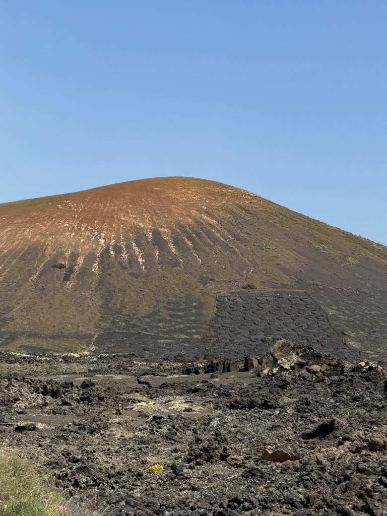 Nous avions ensuite rendez-vous dans une bodega au coeur de la Geria pour une dégustation de vin. Vous pouvez (si vous avez plus de temps que nous) vous arrêter à la Caldera colorada ou à la Caldera de los Cuervos, un ancien volcan dont on peut facilement en faire le tour à pied, puis entrer à l’intérieur du cratère par une ouverture naturelle. Le contraste entre les pentes sombres, le silence du lieu et la sensation d’être “au cœur du volcan” en font une expérience immersive et assez unique. Malgré l’aridité, une petite vie végétale s’y est installée, preuve de la lente reconquête de la nature après les éruptions.