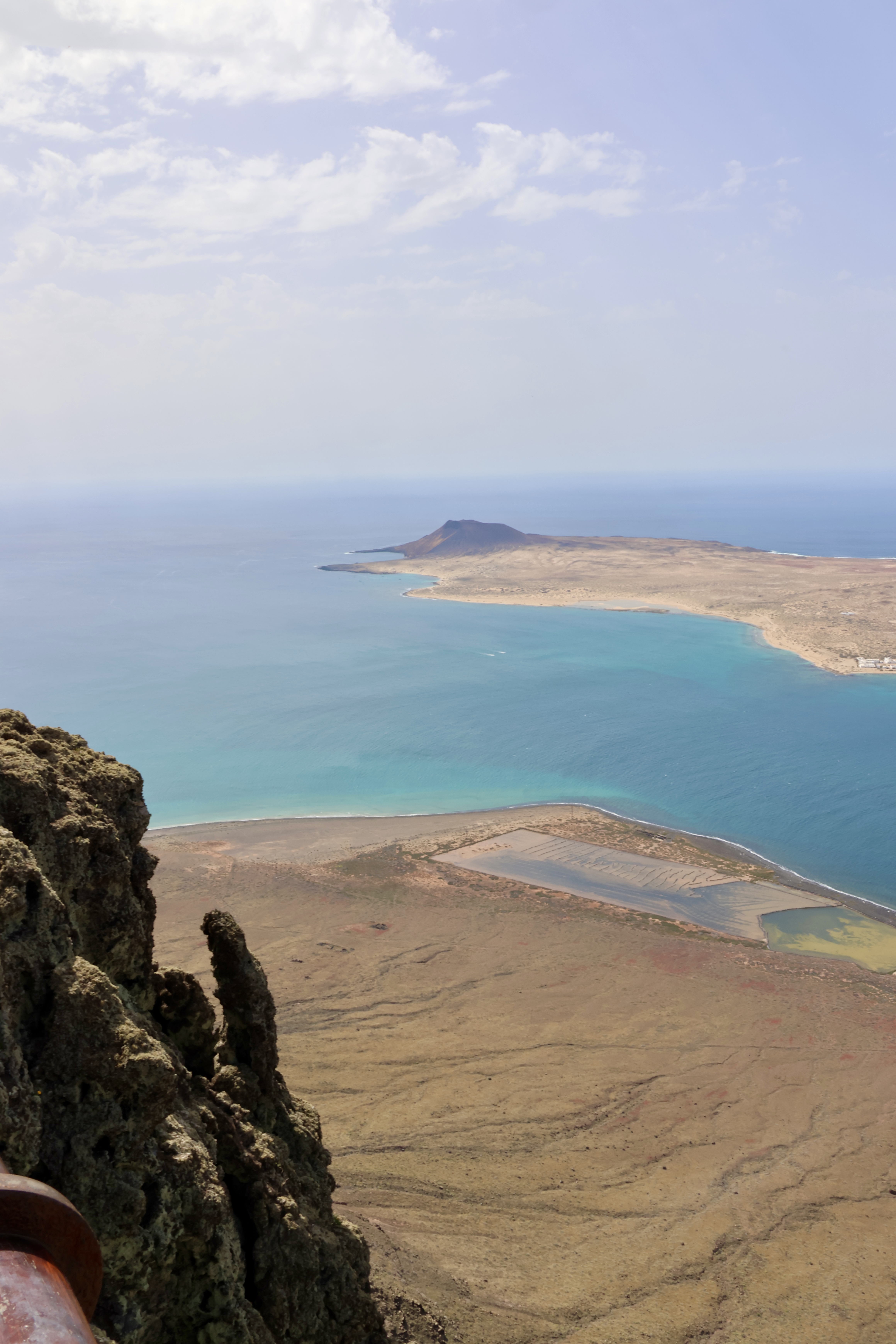 Devant nous une falaise avec étroite bande de mer appelé El Rio qui sépare Lanzarote à l’île de la Graciosa.